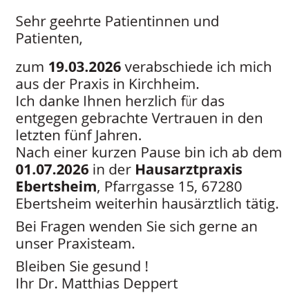 zum 19.03.2026 verabschiede ich mich aus der Praxis in Kirchheim. Ich danke Ihnen herzlich für das entgegen gebrachte Vertrauen in den letzten fünf Jahren.